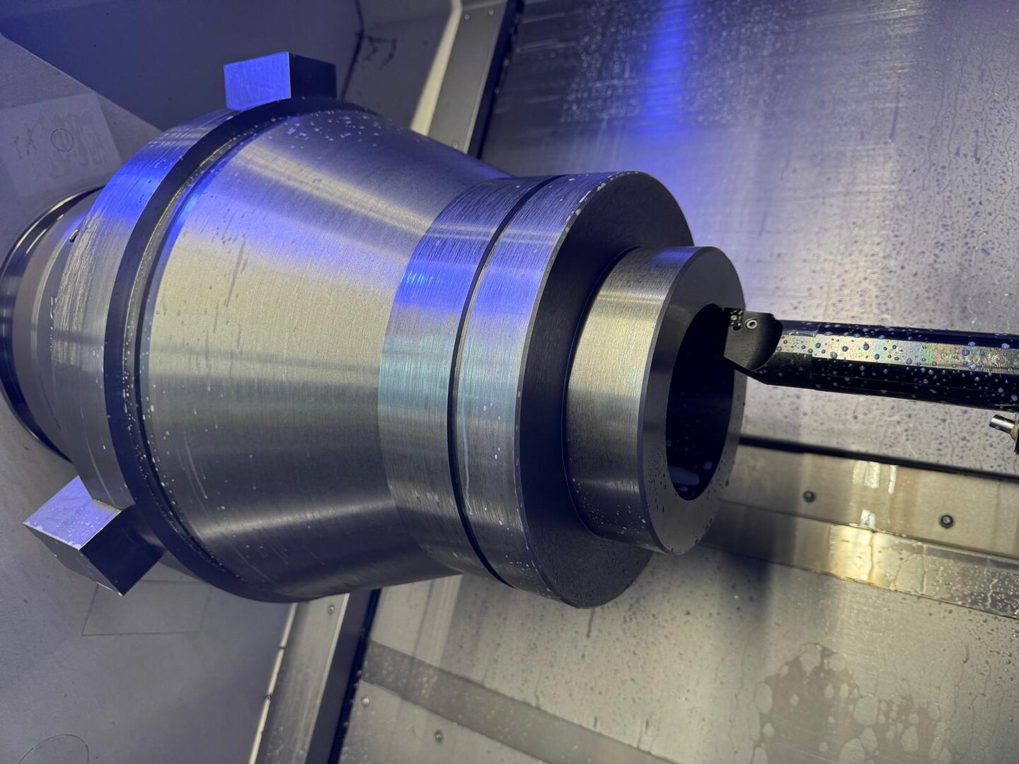 Bearbeitung von zentrischen Bohrungen in runden Bauteilen im gegenläufigen Bohrverfahren mit ELB (Einlippenbohrsystem).